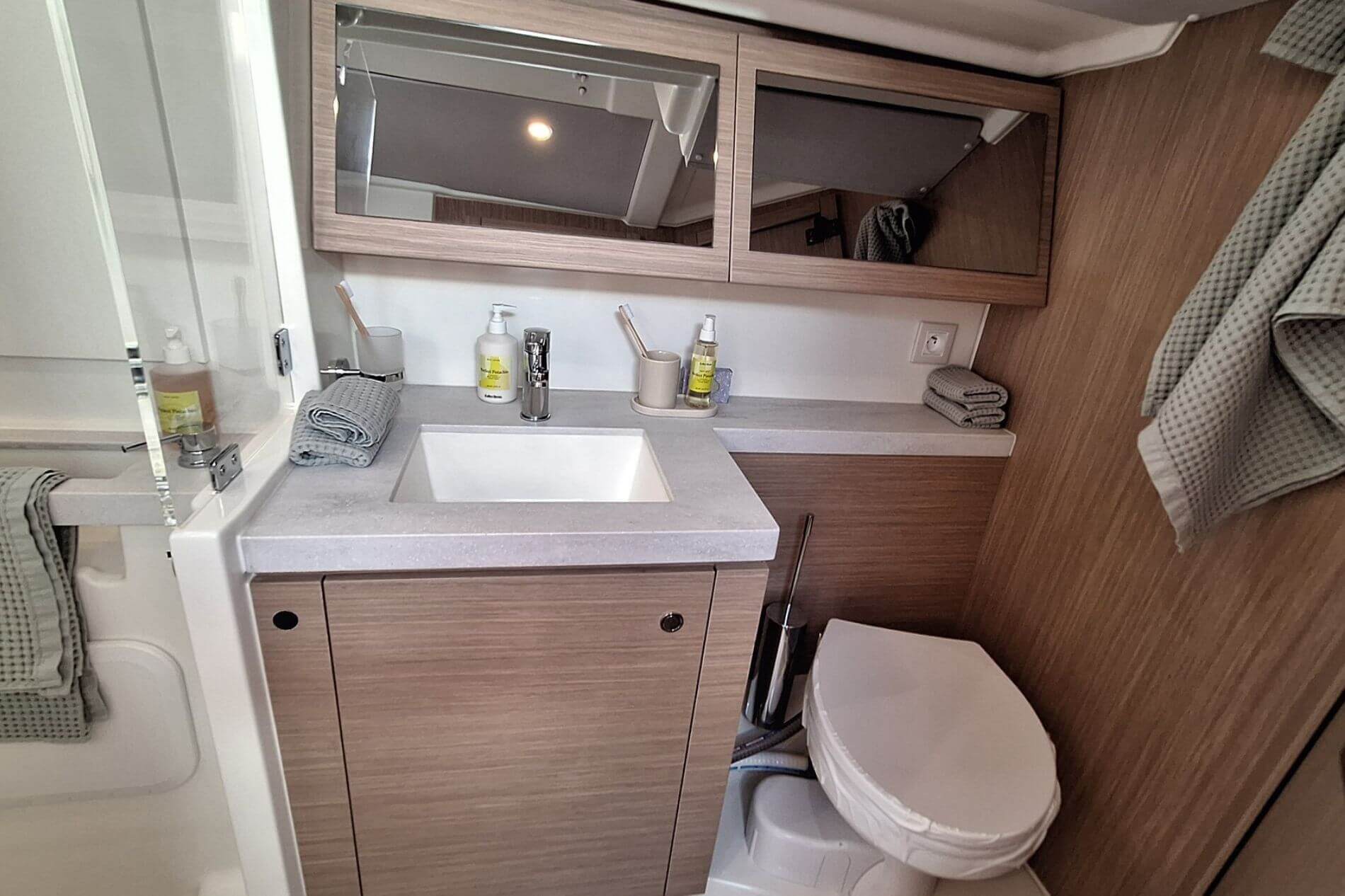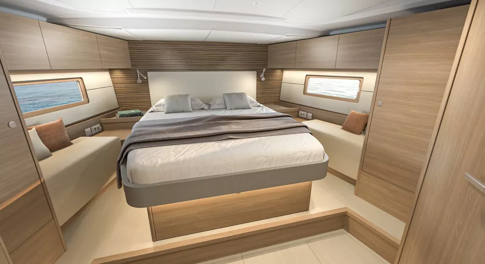 The Oceanis 52’s owner’s suite is a highlight — spacious, serene, and refined in every detail. A generous 160 cm bed, upholstered headboard, and expansive storage — including hanging lockers, coaming compartments, and a full under-bed drawer — make this a true private retreat.