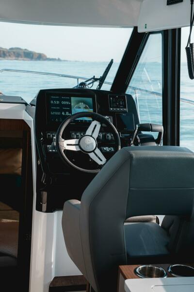 Her ergonomic helm station, equipped with an adjustable bolster seat, offers the captain a breathtaking view of the horizon and ideal handling, even while docking, with a side access to the wheelhouse. With this new model, each outing is a temptation.