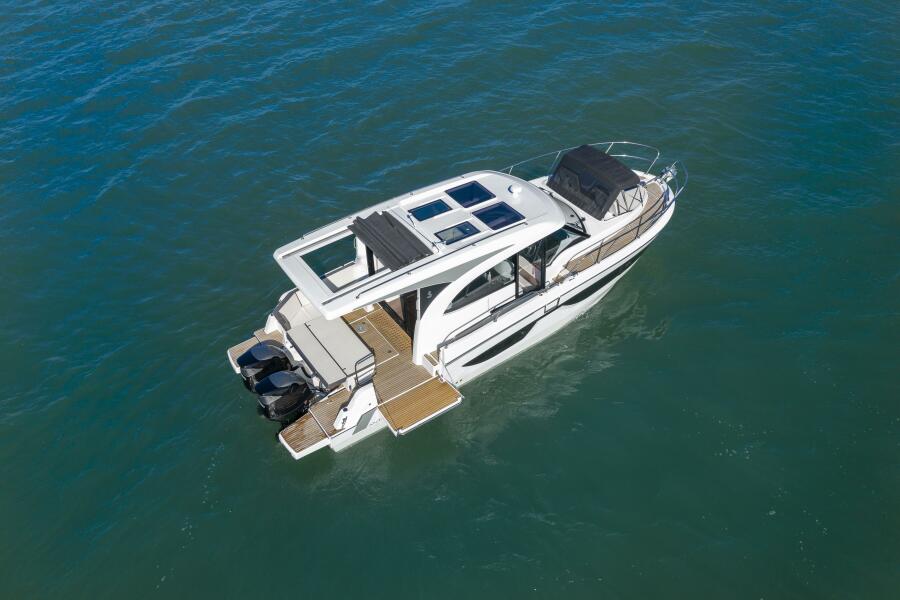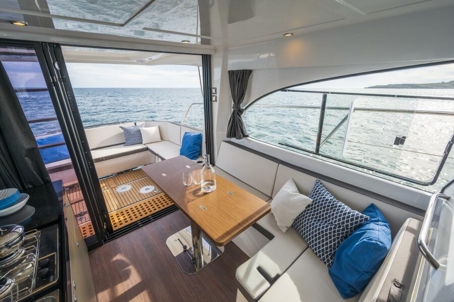 Natural light and cruising comfort characterize this large weekender. The double master cabin with its ensuite shower room is well above the usual standards. The full beam aft cabin has room for three. In the salon, the Antares 11 can easily entertain up to 7 while you enjoy the stunning views through her panoramic windows.