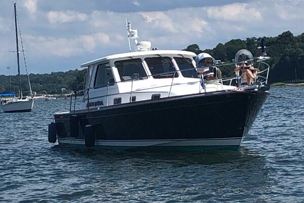 The SABRE 38' Express combines classic Downeast styling and lively performance in a hardtop cruising yacht of exceptional beauty. Built on a vacuum-bagged hull with moderate beam and prop pockets to level the engines, the focal point of the 38' SABRE Express is her semi-enclosed helm deck with its Stidd helm and companion chairs, sliding glass side windows, and wet bar with refrigerator and ice maker.