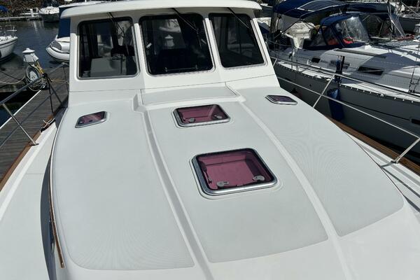 The hardtop has a pair of screened hatches for ventilation. Wide side decks make bow access easy and secure.