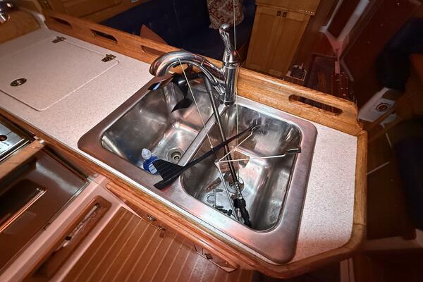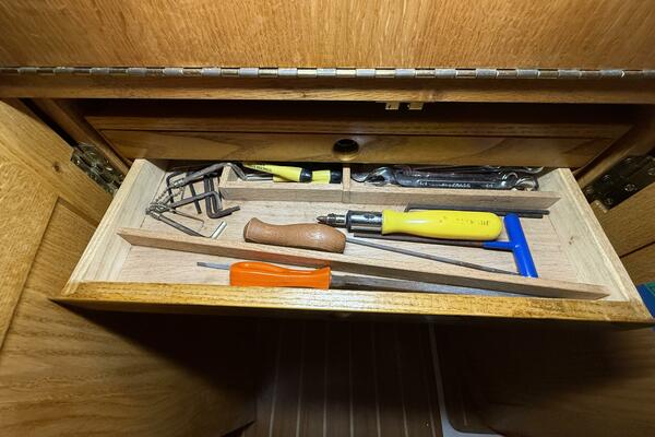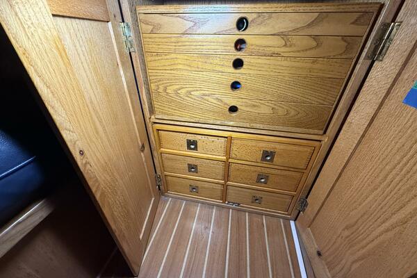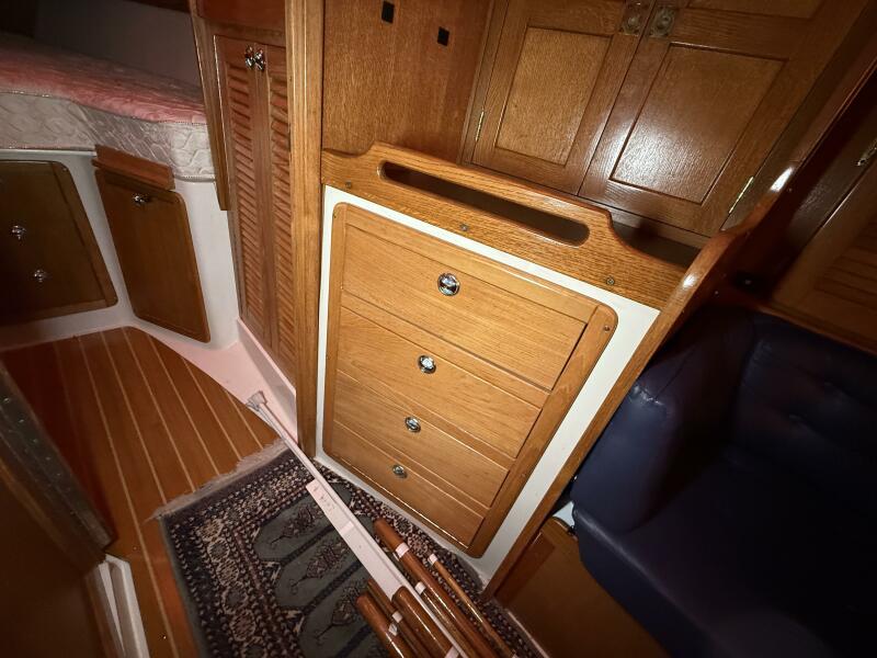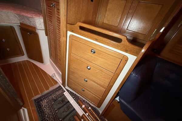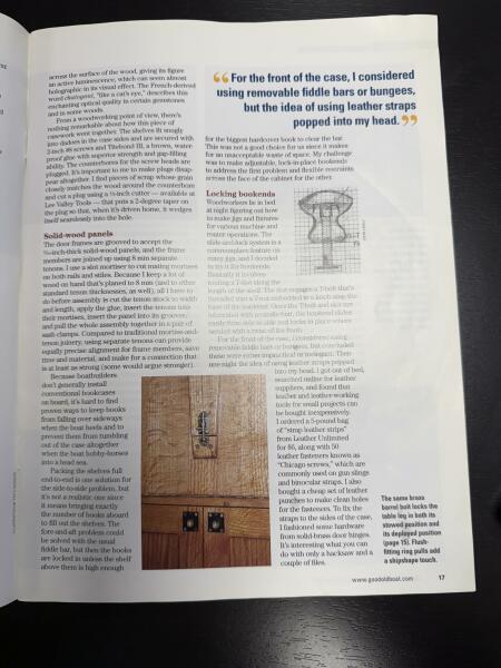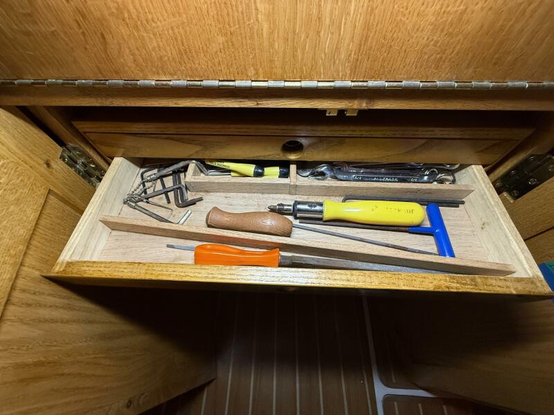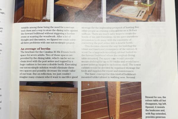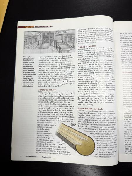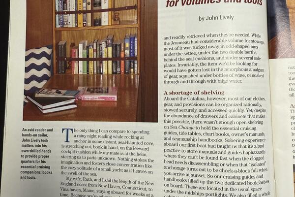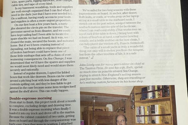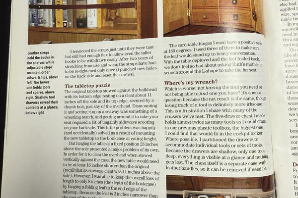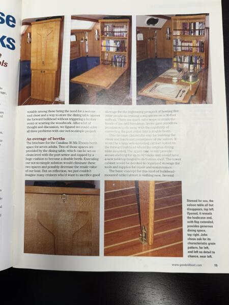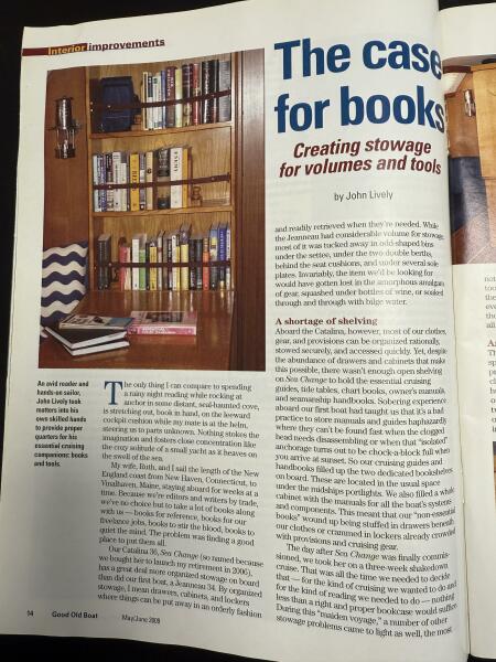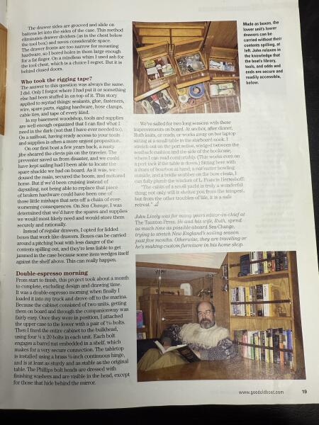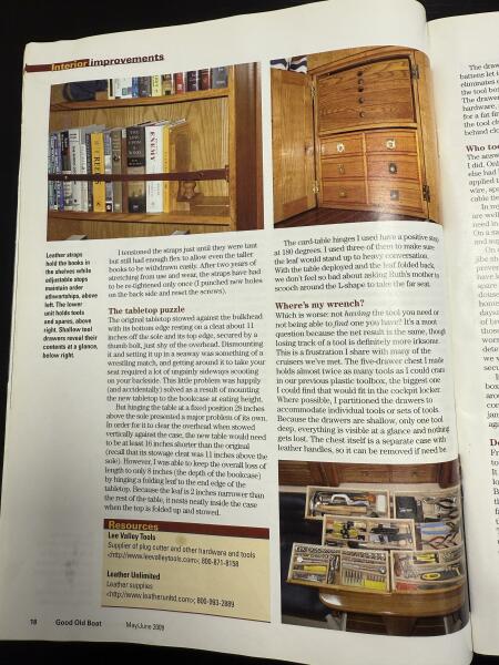 Alright, maybe one in ten are equipped and maintained like this and they occasionally come along if you wait long enough, but what else could one do to improve safety, increase storage while improving the look, feel and livability? Well if your the original owner and editor of Architectural Digest, you design and build custom wood cabinetry, fiddles, tables, handholds & more. When you do all this well enough, Good Old Boat Magazine takes notice and does a six-page article on your boat!